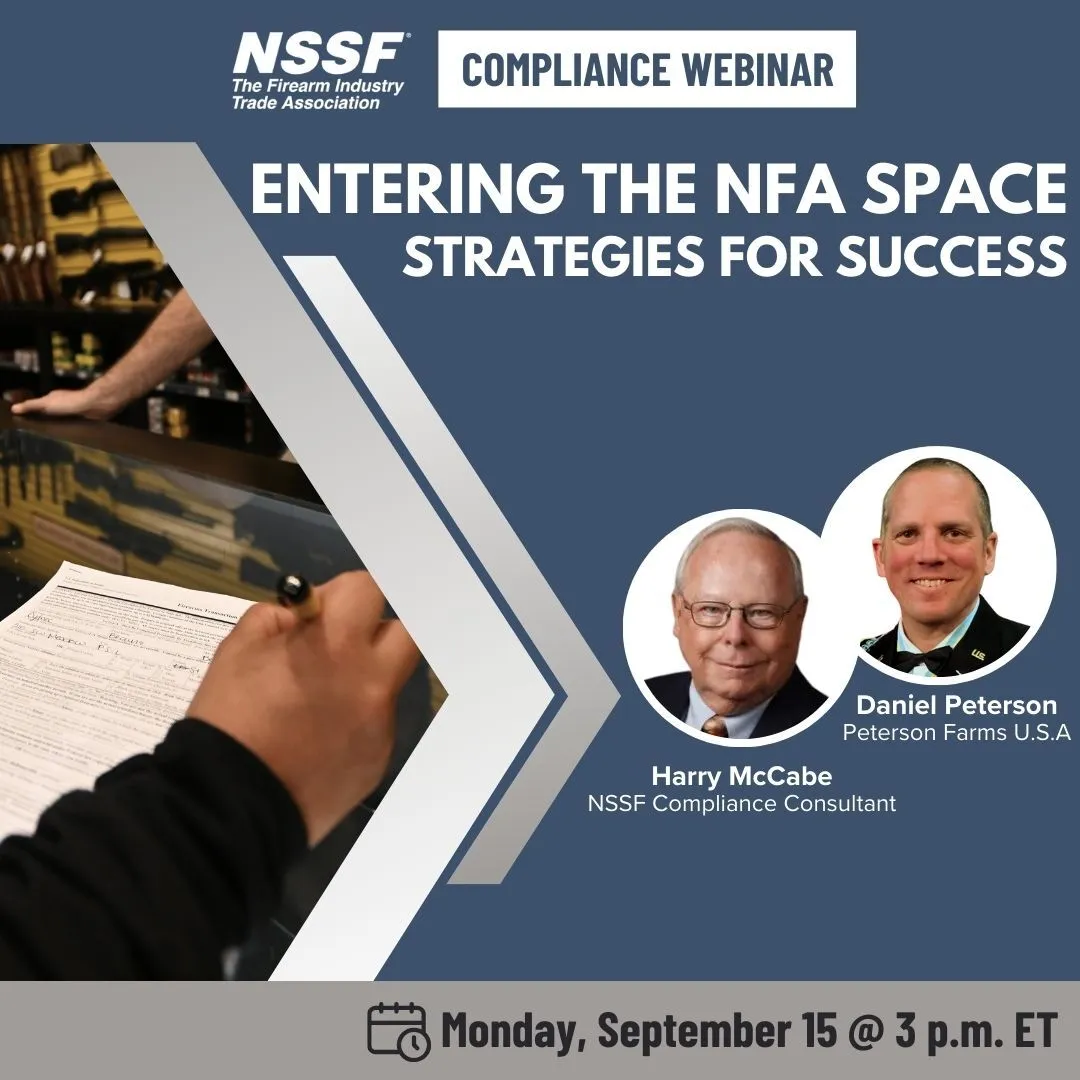 Led by NSSF FFL Compliance Consultant Harry McCabe and Dan Peterson of Peterson Farms USA, this webinar will equip attendees with the necessary tools and knowledge to navigate the complexities of the NFA landscape. This is an opportunity to deepen your understanding of the market and enhance your business strategies within this specialized segment of the firearm industry.